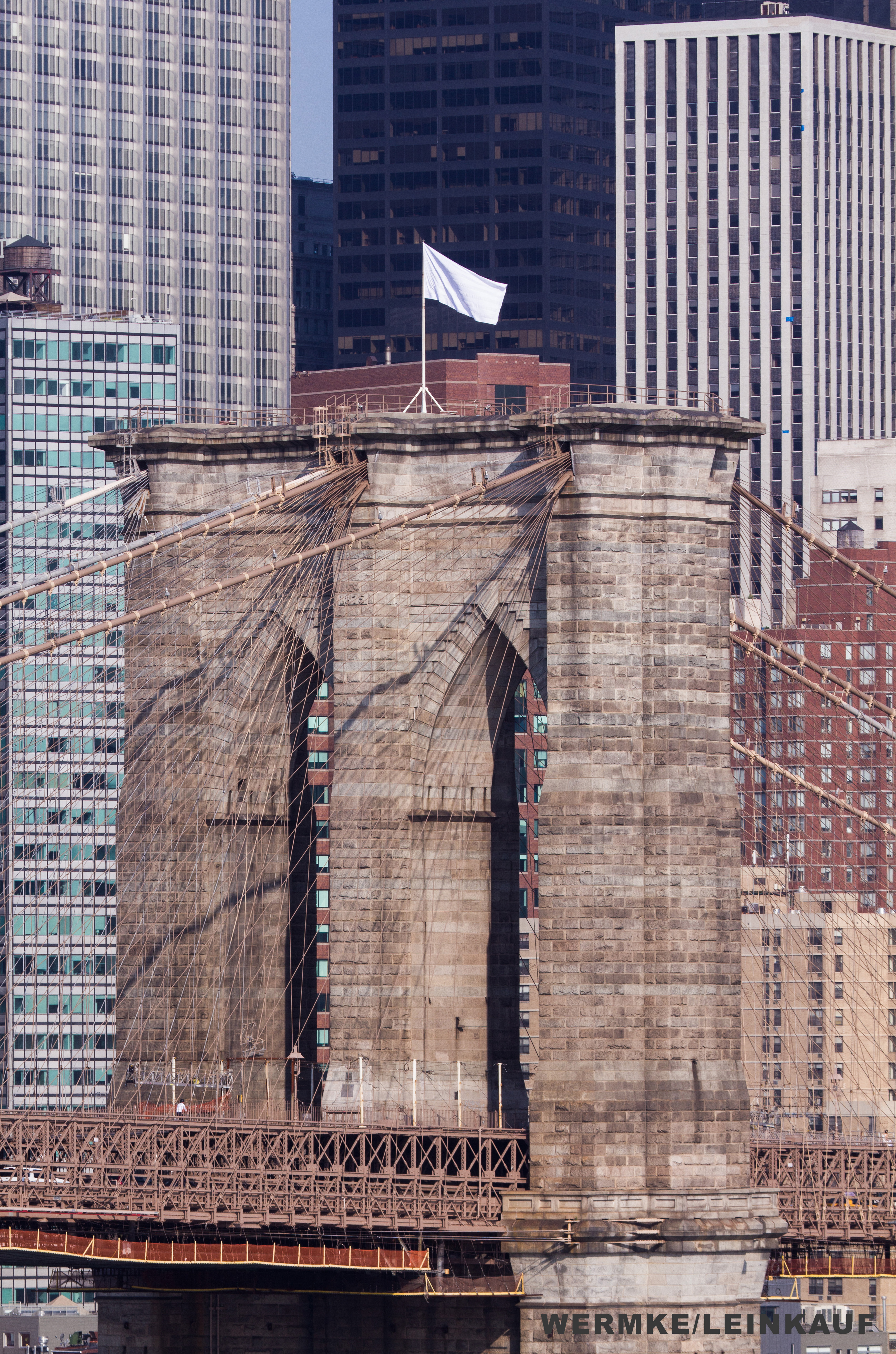 On the night of 22 July 2014, Matthias Wermke and Mischa Leinkauf hoist two white American flags on the Brooklyn Bridge in New York City. They take the US flags down and fold them in the prescribed orderly fashion.