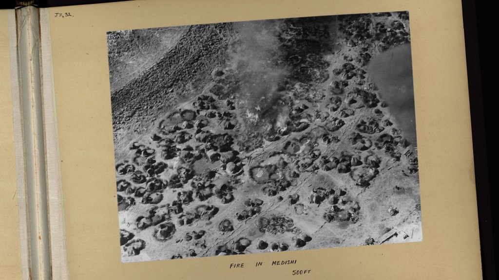Fotografien von Wüstenlandschaften. Das Land wird abgetastet, das Land wurde abgetastet, man versucht etwas daraus zu lesen. Ein Besuch im Fotoarchiv. Weiße behandschuhte Hände werden evoziert, die Artefakte bewegen. Für wen? Was ist in dem Bild? Was erzählt diese Aufnahme? Kolonialer Blick aus dem Flugzeug 1920, ab welcher Höhe sieht man was? Die Erde ist bewohnt von Miniaturen, Menschen, Lasttiere, Festungsmauern wirken wie abstrakte Grundrisse. Wer lebt da? Wer schaut auf die Fotografien in London? Wie schaut man auf die Fotografien in London? Eine Tonkulisse zieht uns tief in die Brunnen in der Wüste und zurück zu den Schreibmaschinen der Historiker. Die rote Schlangenhaut von den Albumsdeckeln war auch einmal ein Wüstenbewohner.