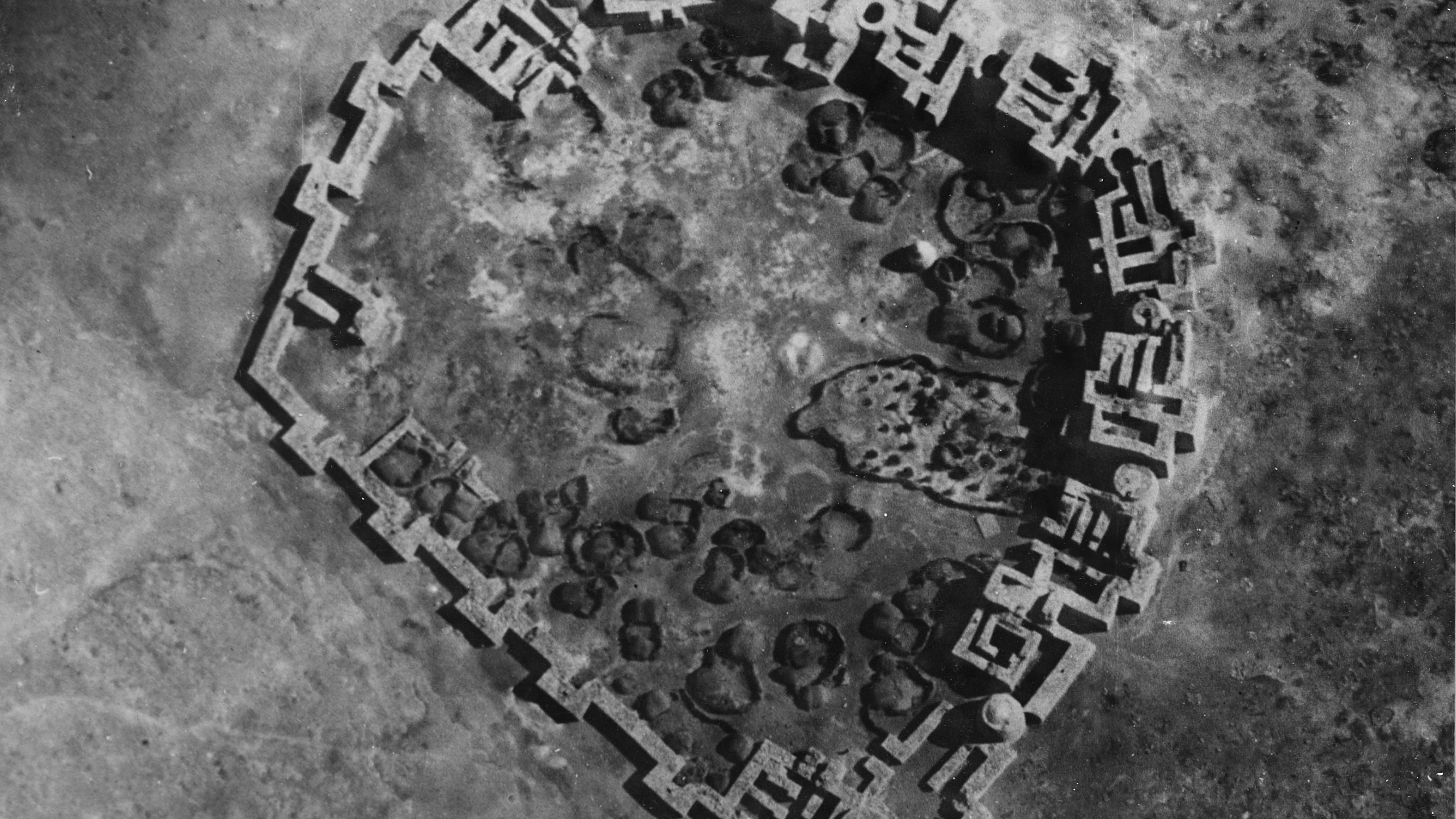 Photographs of desert landscapes. The country is being scanned, the country was scanned, and people try to read something into it. A visit to a photo archive. White-gloved hands are evoked that move artefacts around. For whom? What does this picture show? What story does this shot tell? A colonial perspective from an airplane in 1920, what are you noticing from different heights? The earth is inhabited by miniatures: people, pack animals, fortress walls look like abstract ground plans. Who lives there? Who is looking at the photographs in London? How do people regard the photographs in London? The soundtrack draws us deep into the wells in the desert and back to the historians’ typewriters. The red snakeskin on the album covers was once a desert-dweller, too.