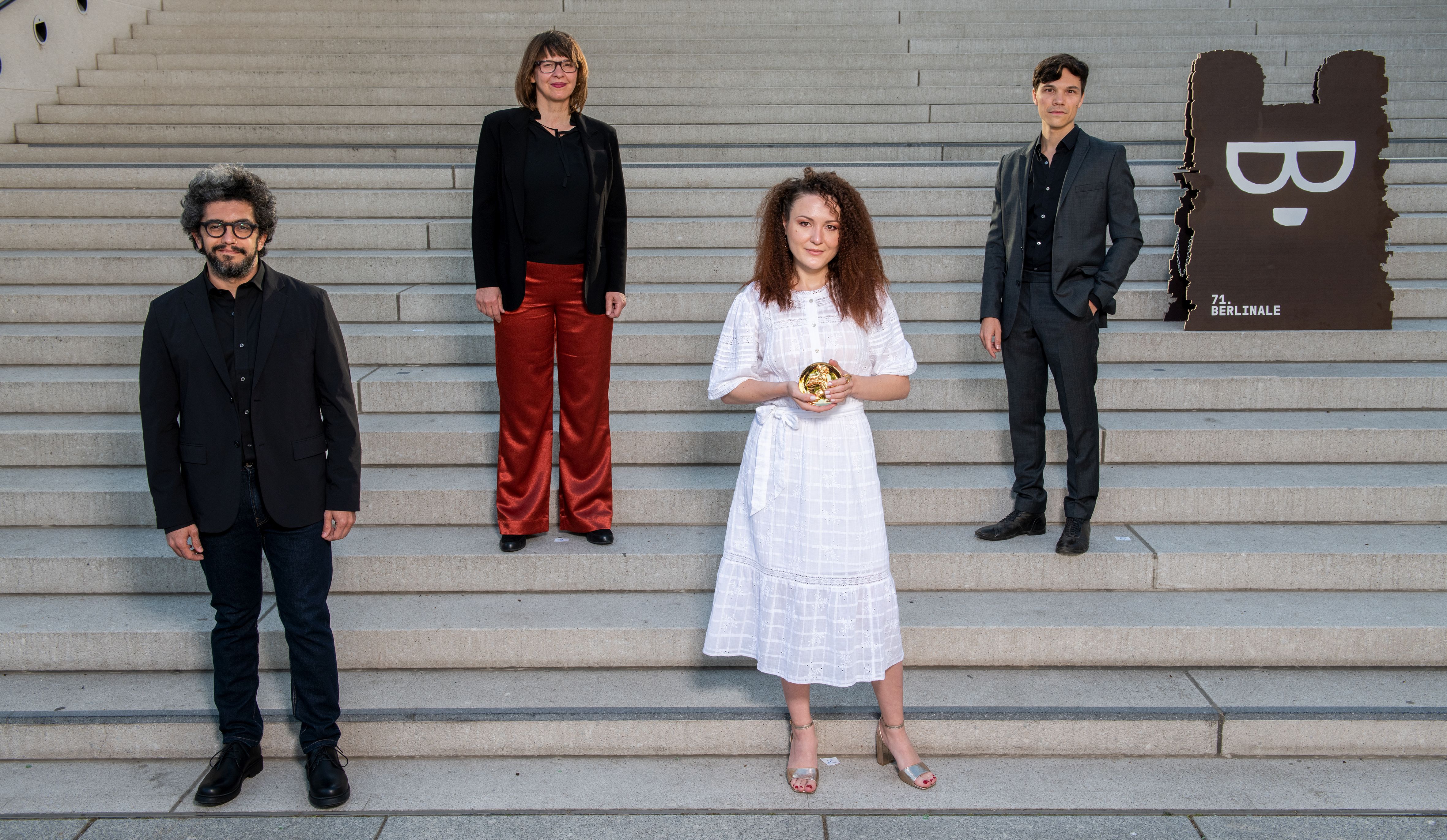 Here she is pictured with Basim Magdy, Christine A. Maier and Sebastian Urzendowsky (from left to right), the three members of the Berlinale Shorts jury at the 71st edition of the Berlin International Film Festival.