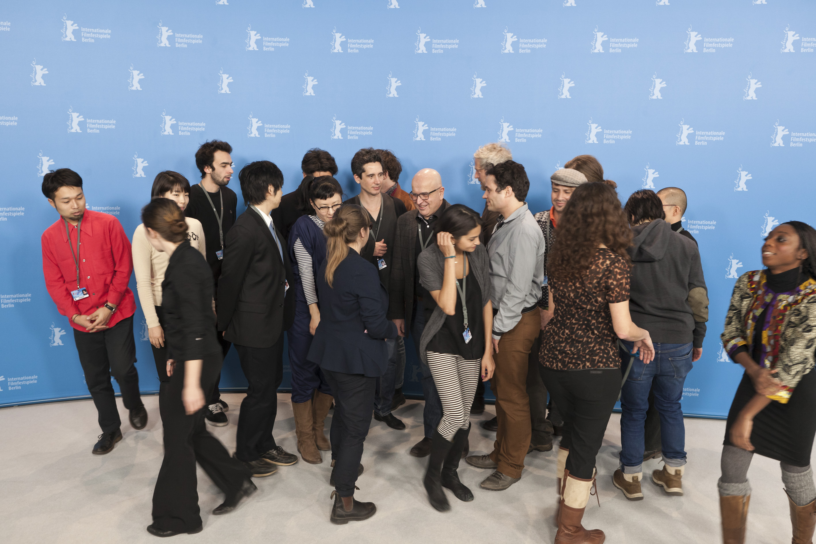 Gruppenbild aller Regisseure, deren Filme im Wettbewerb der Berlinale Shorts laufen, mit Kuratorin Maike Mia Hoehne