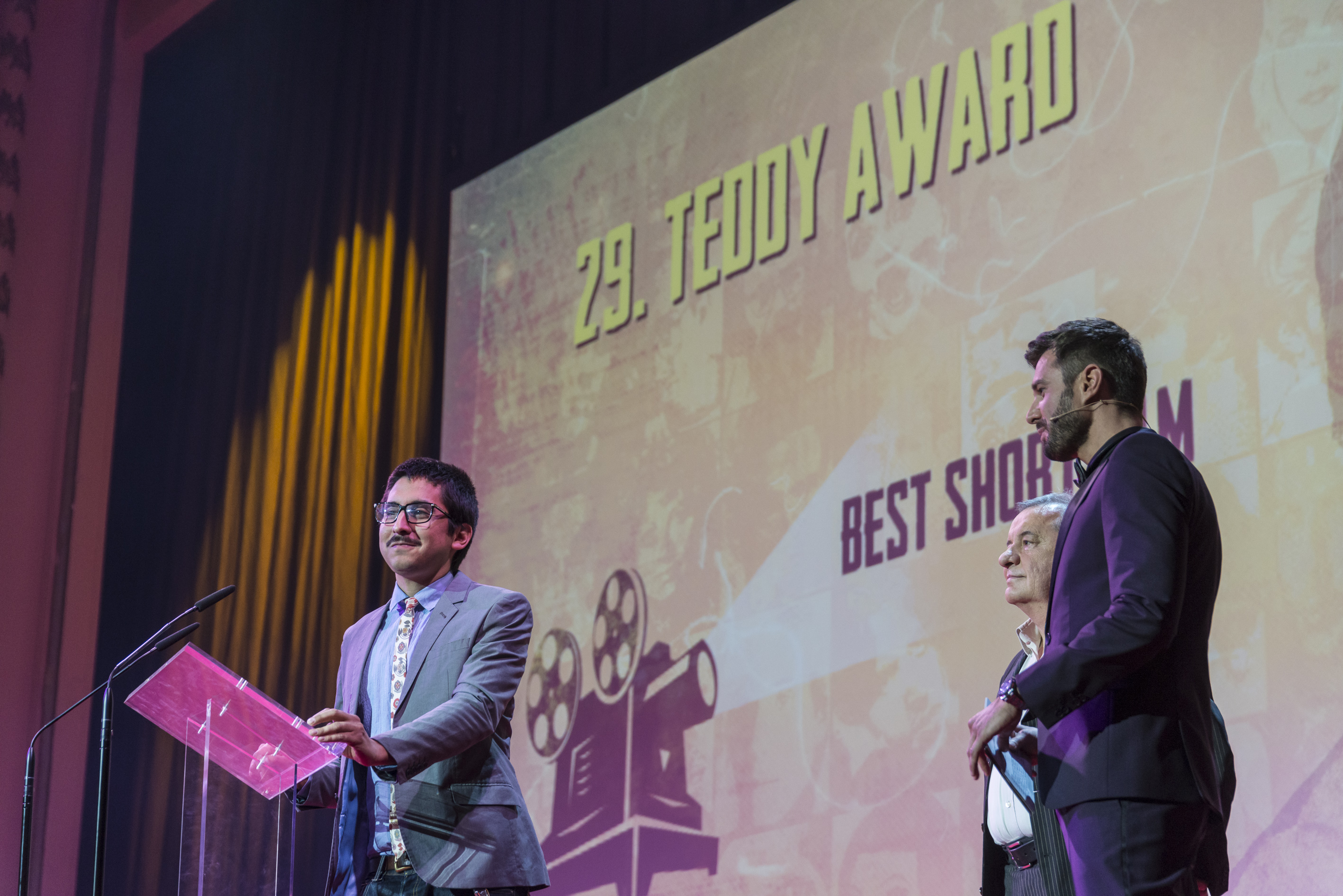 Zúñiga Hidalgo Omar gewinnt fuer seinen Kurzfilm „San Cristóbal“ den Teddy-Award bei der Preisverleihung in der Komischen Oper Berlin