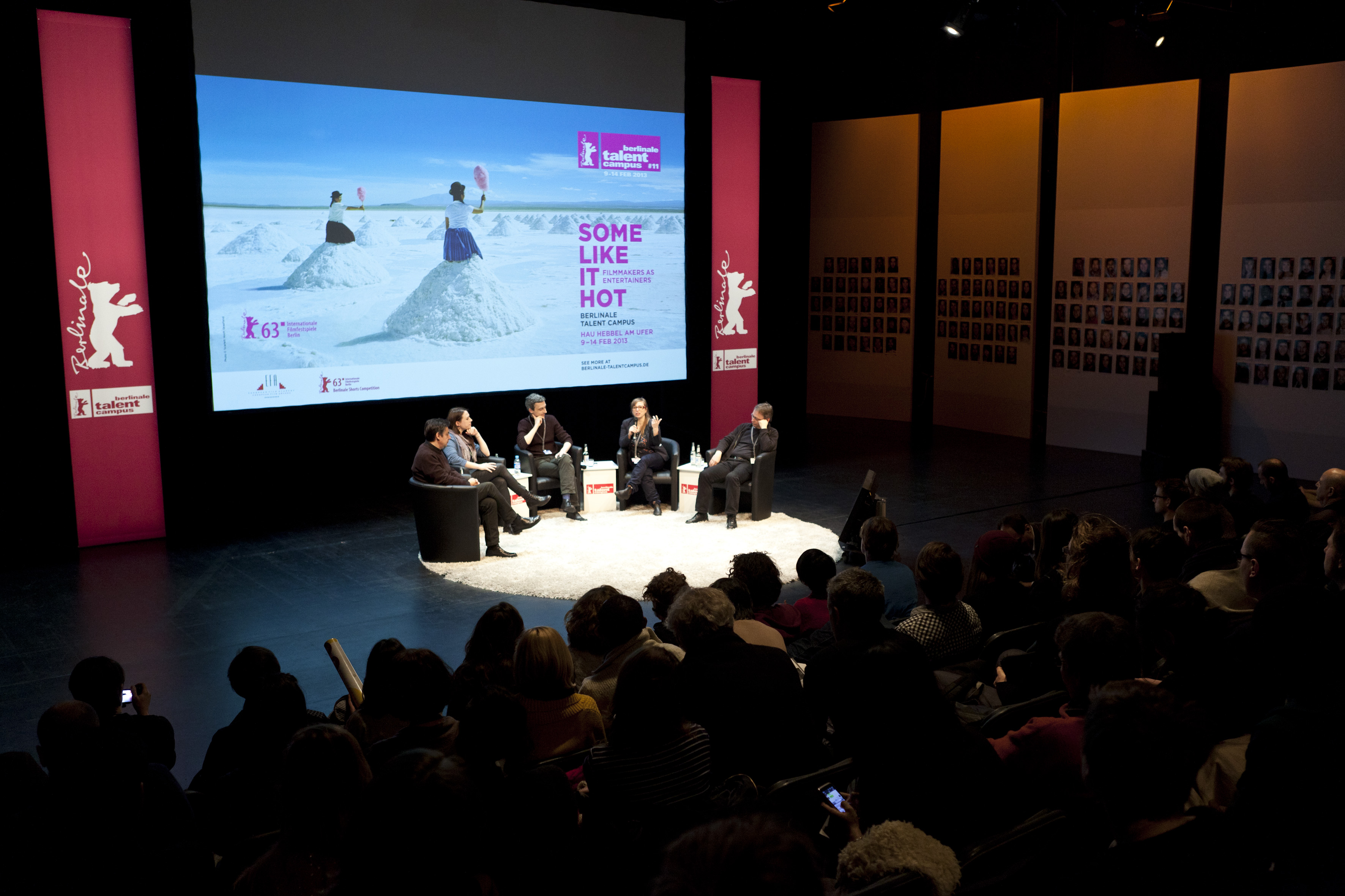 Programmer Europaeischer Kurzfilmfestivals stellen ihre Festivals dem Publikum im Hau 2 beim Berlinale Talent Campus vor; Mario Micaelo, Vanja Kaludjercic, Laurent Crouzeix, Maike Mia Hoehne, Jukka-Pekka Laakso